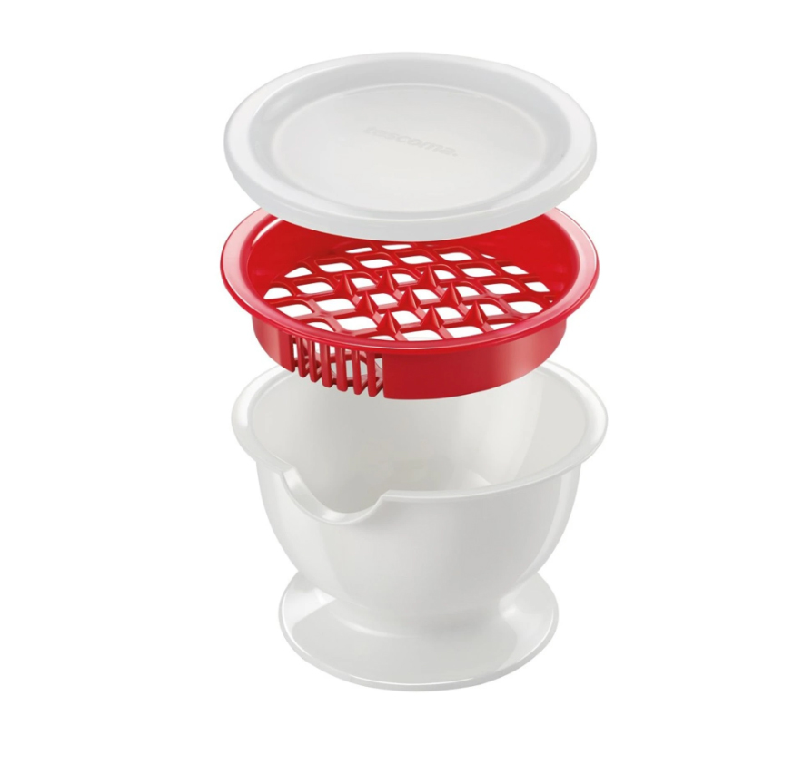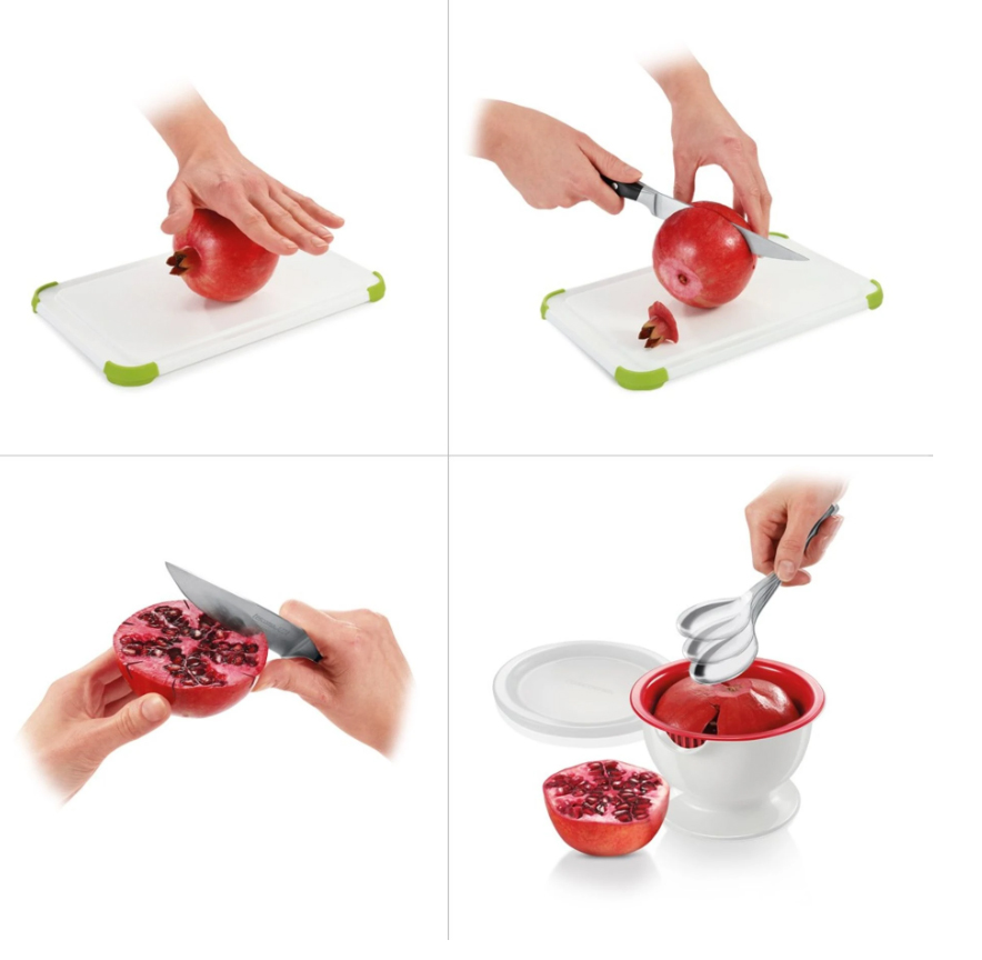 Excelente para facilmente separar as sementes da romã da casca. Prevenido com uma tampa para as poder conservar no frigorífico. Fabricado em plástico resistente. Pode ir à máquina de lavar louça. 3 anos de garantia.