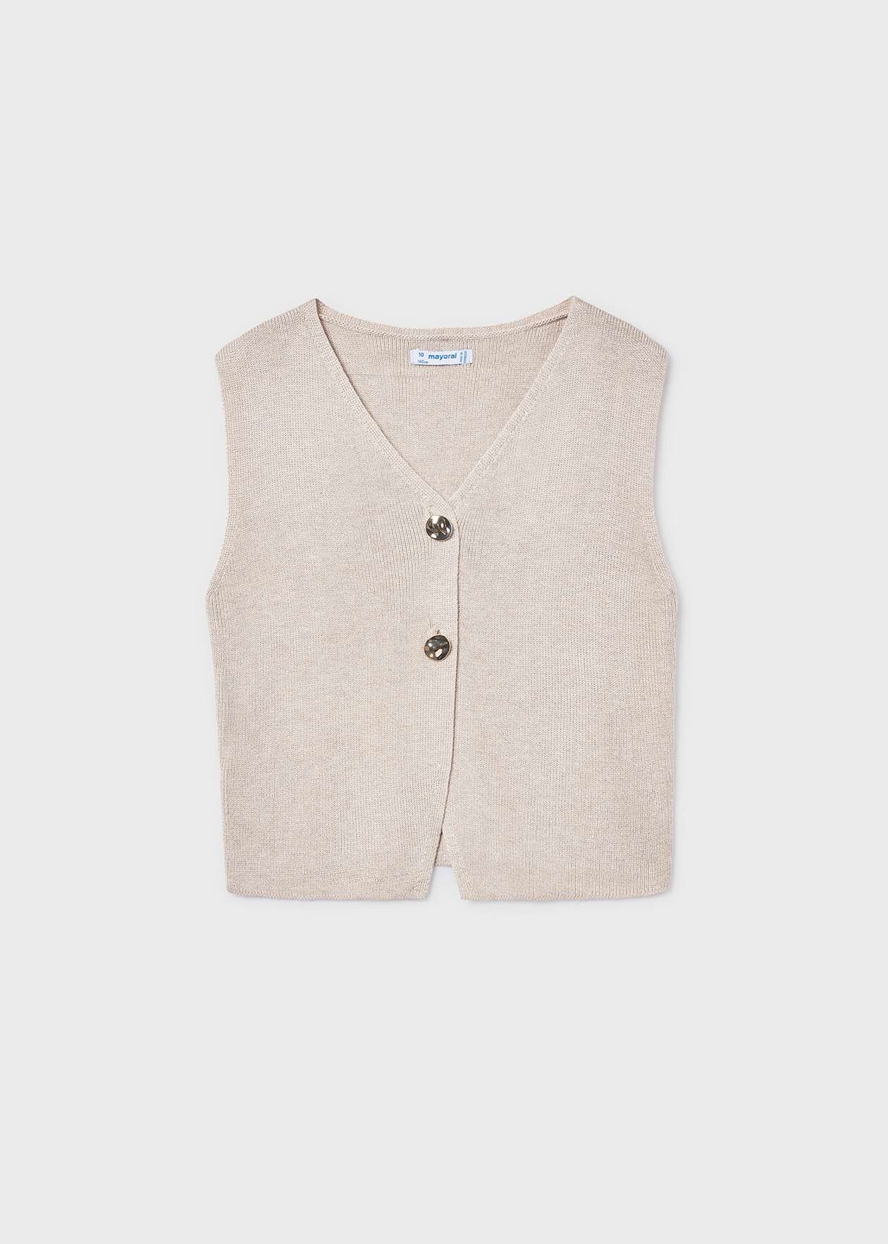 ​Colete de Malha Bege com Botões para Menina - Coleção Mayoral KidsPerfeito para o "layering" das estações de transição, este colete Mayoral combina o conforto da malha macia com um design sofisticado. O seu tom bege neutro torna-o a peça "curinga" ideal, combinando facilmente com camisas clássicas para um look formal ou com t-shirts para um estilo mais casual.Os detalhes dos botões frontais em tons de contraste e o decote em V conferem um toque de "mini-lady" que é tendência absoluta na moda infantil...