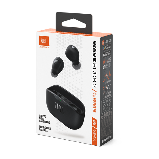 Os fones de ouvido JBL Wave Buds 2 contam com o empolgante som JBL Pure Bass, além de cancelamento ativo de ruído e tecnologia Smart Ambient, tornando-os um companheiro de áudio divertido e prático para o dia a dia.