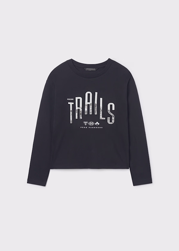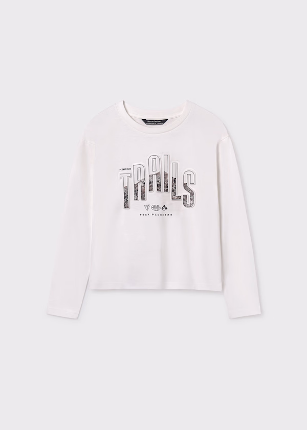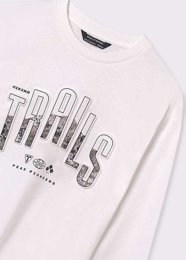 Gola redonda. Elementos decorativos: detalhe em relevo (relevo), Serigrafia (print). Motivo decorativo com letras.