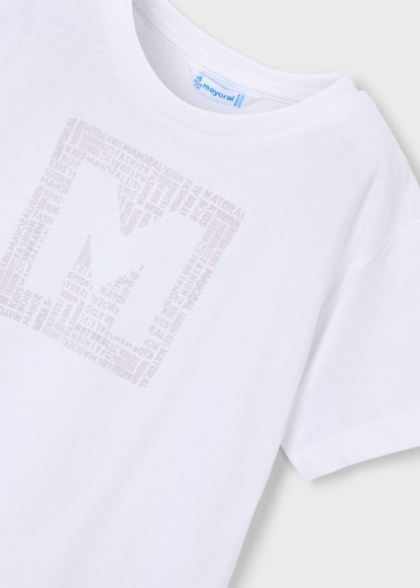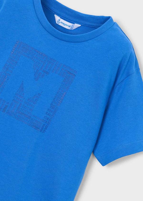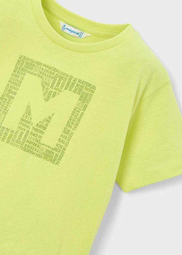 T-shirt de manga curta Mayoral para menino, disponível em várias cores como azul celeste, laranja vibrante, branca e verde-lima.