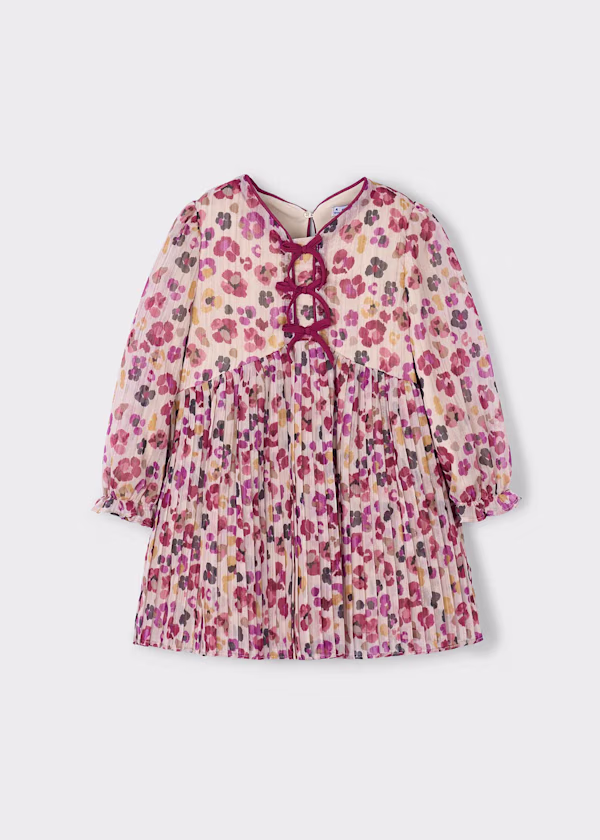 Gola redonda. Pequena abertura nas costas com botão para facilitar a colocação da peça. Forro interior em poliéster macio. Modelo frisado e com folhos. Elementos decorativos: laço. Design estampado
